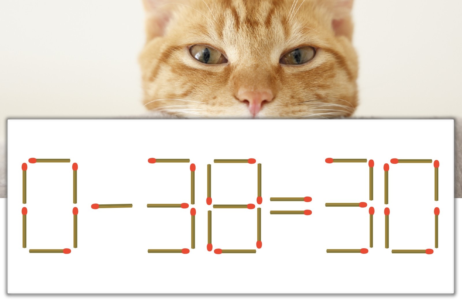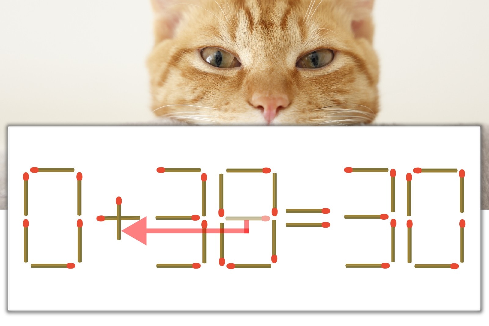 「8」を別の数字に変化させると答えが導き出せます。「8」のマッチ棒を1本移動して、「-」を「+」にしてみましょう。すると、「0+30=30」が成立します。