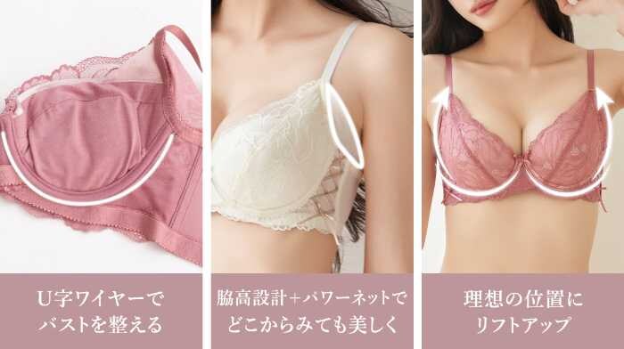 メッシュ素材の幅広サイドベルトが背中や脇のハミ肉を防ぎ、段差をフラットに整えてくれるのが特徴。立体三枚ハギ構造とU字ワイヤーで、ふっくら丸みのある美胸をキープします。