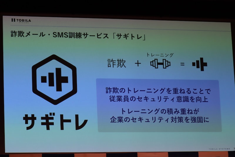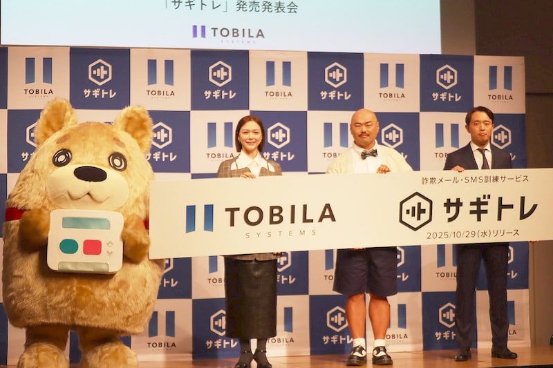 トビラシステムズ株式会社は、10月29日に法人向け詐欺メール・SMS訓練サービス「サギトレ」の提供を開始したことを発表。同日には発表会も行われ、タレントの村重杏奈、安田大サーカスのクロちゃん、立正大学の西田公昭教授が登壇し、詐欺の手口やどうすれば被害を防げるのかについてのトークセッションが行われた。