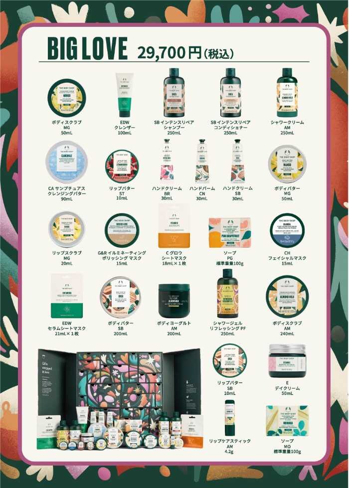 「ビッグラブ」(29,700円)は、レギュラーサイズ中心の豪華仕様で、スキンケアやボディケアを存分に楽しめる内容です。