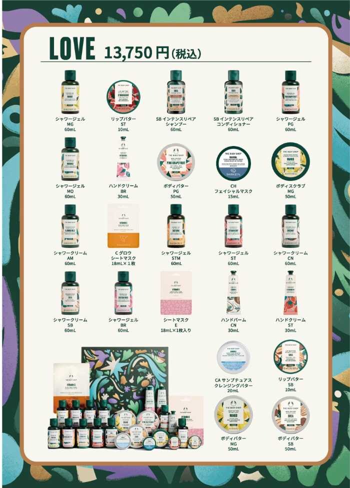 「ラブ」(13,750円)は、ミニサイズのボディケアや現品サイズのマスクなど、デイリーに使えるアイテムがたっぷり。