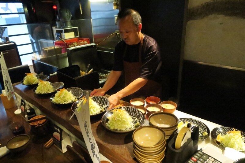 カウンター席からは店主・野溝太志さんが丁寧にとんかつを揚げる姿がよく見えます。