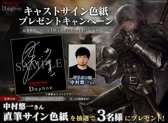 『Wizardry Variants Daphne』公式X(旧Twitter)にて、抽選で3名様にギリオン役 中村悠一さんの直筆サイン入り色紙が当たるフォロー&リポストキャンペーンを実施いたします。