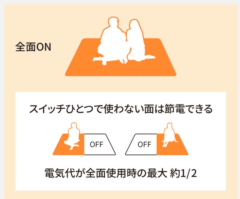 ホットカーペット自体の消費電力は高くありませんが、Panasonicはさらに「省エネモード」や「2面切替(片面だけ温めるモード)」を搭載。