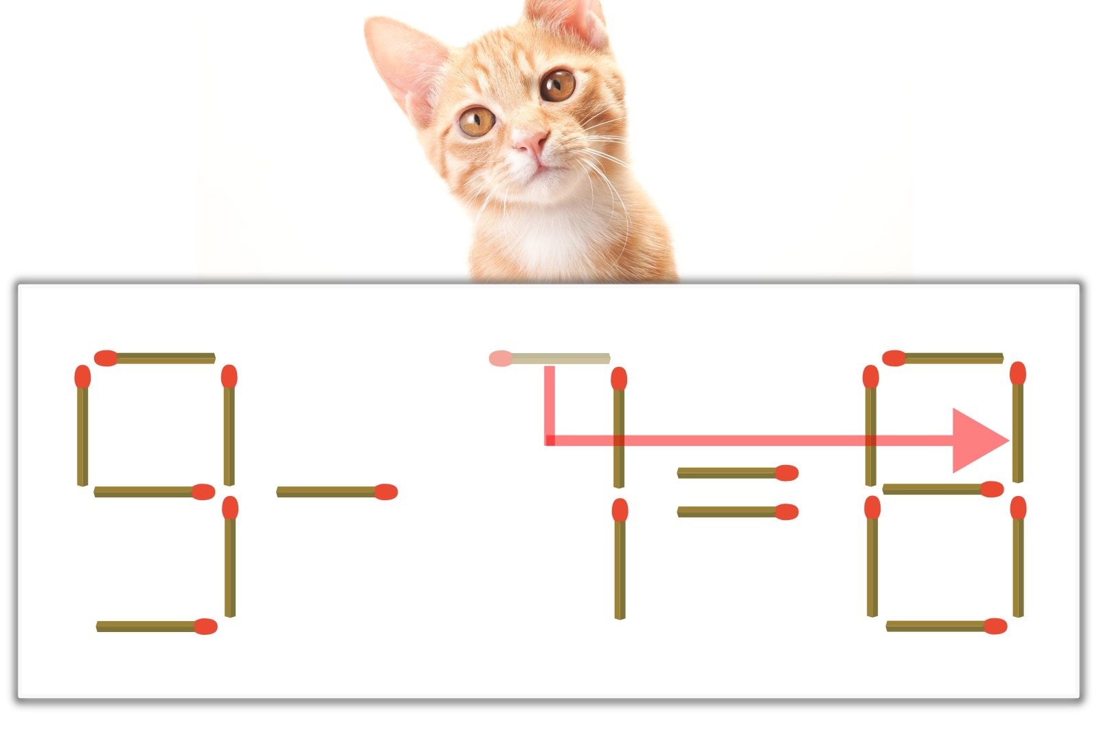 「7」のマッチ棒を1本、右にスライドさせて「8」を作り、「9-1=8」にする。※解答は複数ある場合があります。