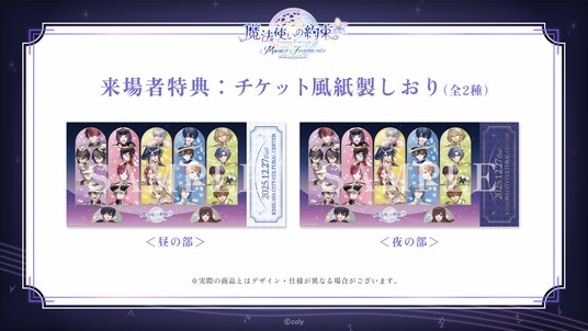 ※来場者特典の「チケット風紙製しおり(全2種)」は、昼公演(1種)・夜公演(1種)でデザインが異なります。