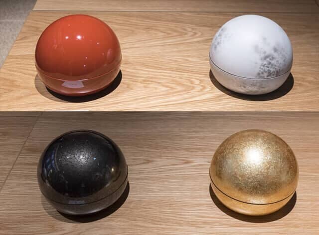 卵を思わせる蓋つきの丼鉢を新調。メニューによって器の色が異なります。赤は「元祖親子丼」、白は「軍鶏づくし親子丼」、黒は「元祖親子丼(すき焼き重ね)」、金色は「天然白レバ入り親子丼」。器の美しさも見どころです。