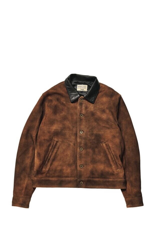 ヴィンテージのワークジャケットに着想を得たデザイン。スウェード素材なのでカジュアルで着やすいのが特徴。フロントボタン仕様ながら、袖はライダースを意識したジッパー仕様という、ショットならではの遊び心が嬉しい。10万7800円