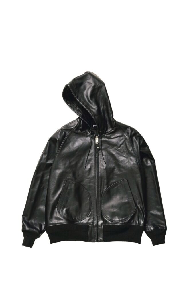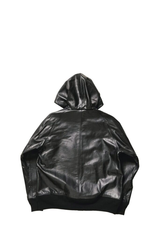 使い勝手の良いジップアップパーカをクロム鞣しのカウハイドに置き換えたユニークな一着。意匠には1930年代のスウェットに着想を得たボクシンググローブ型のハンドウォーマーポケットを採用。カジュアルな仕上がりなので、普段のパーカを着る感覚でコーディネイトにレザーを追加できる。11万4400円