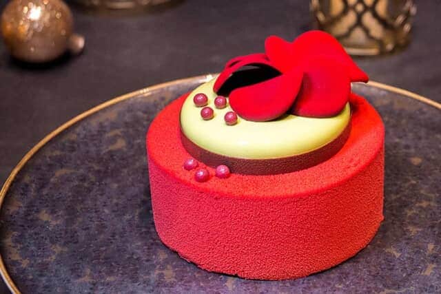 今年の新作<THE KAHALA CHRISTMAS 2025 “ROUGE”>は、その名の通り真っ赤なケーキ。フリュイルージュ(赤い果実)を使った鮮やかな色使いには、ピスタチオクリームでクリスマスカラーの緑をプラス。トッピングしたチョコレートの花はポインセチアやシクラメンではなく、ハワイのフラワーレイに好んで使われるプルメリアを選ぶのも、ザ・カハラ 横浜ならではのこだわりです。