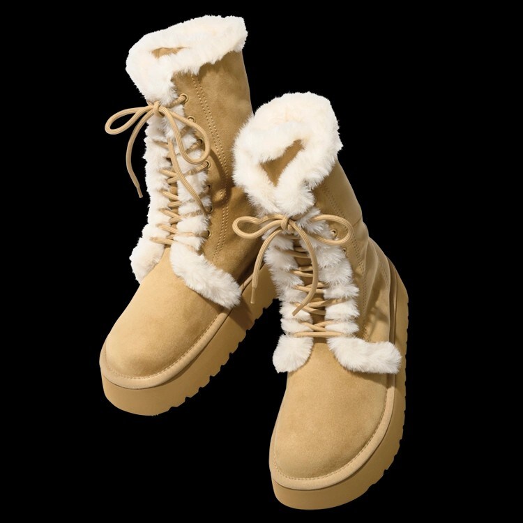 レースアップデザインとボリュームのあるプラットフォームソールが印象的なミッドカーフブーツ。クセありムートンが斬新♡