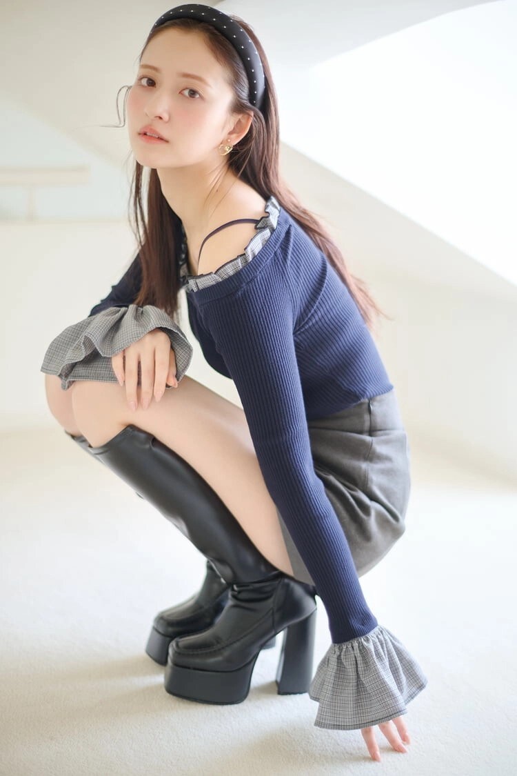 フリルスリーブオフショルニット 9,790円/MERCURYDUO ルミネエスト新宿店 ショートパンツ 7,700円/RESEXXY カチューシャ 550円/WEGO ハートピアス 1,500円/accessoryshop mary ロングブーツ 14,960円/REDYAZEL ルミネエスト新宿店