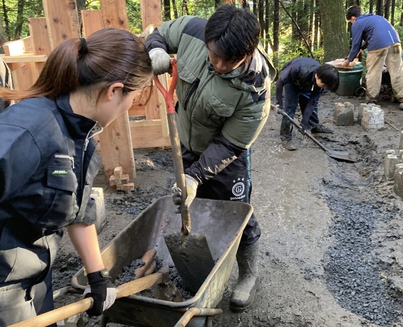 森の中では、木の香りとノコギリの音、そして学生たちの笑い声が混ざり合っていました。