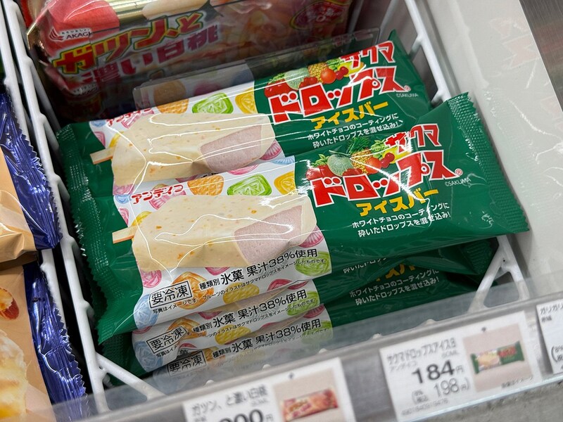 その商品とは「サクマドロップスアイスバー」(アンデイコ)。名前の通り、サクマドロップスを粉砕して混ぜ込んだというかわいらしいアイスバーです。販売価格は税込198円で、数量限定商品となっています。
