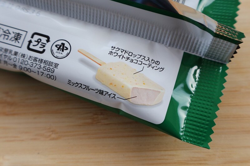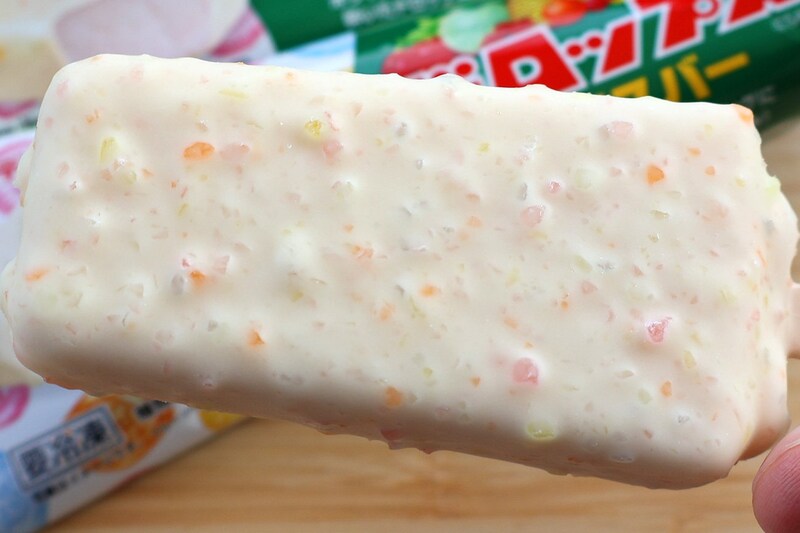 ファミリーマートで買って家に持ち帰り、一息ついてパッケージを開封。スティックをゆっくりと引っ張り出していくと、ホワイトチョコでコーティングされたアイスに混ぜ込まれたキラキラと輝く7色のサクマドロップスが見えてきます。