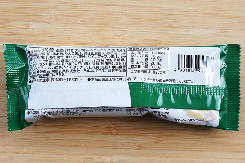 原材料を確認してみると、いちご果汁、メロン果汁、もも果汁、オレンジ果汁、パインアップル果汁と、実に5種類もの果汁をちゃんとミックスしていることがわかります。ミックスフルーツ風ではなく、正真正銘のミックスフルーツ味アイス。しかも、その果汁はなんと38%!