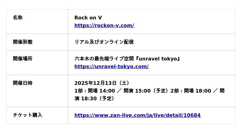 「All for Streamers」のコンセプトで、YouTube・Twitch・Mirrativなどの各配信プラットフォームで活動する配信者(VTuber/ストリーマー等)を支援する株式会社ミラティブ(本社:東京都目黒区 代表取締役:赤川隼一)のグループ会社である、株式会社アイブレイド(本社:東京都板橋区 代表取締役社長:妻木 泰夫)が企画・運営プロデュースをするVTuber × 生バンドの新感覚音楽フェス 『Rock on V』 の第8回公演を、2025年12月13日(土)に東京・六本木のライブハウス「unravel tokyo」にて開催することをお知らせいたします。