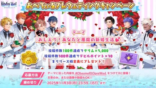 事前登録開始を記念して、「おべてぃるプレウェディングキャンペーン」を開催いたします!ぜひご参加いただき、『Obey Me! Till Death Do Us Part』の世界を一緒に盛り上げましょう!