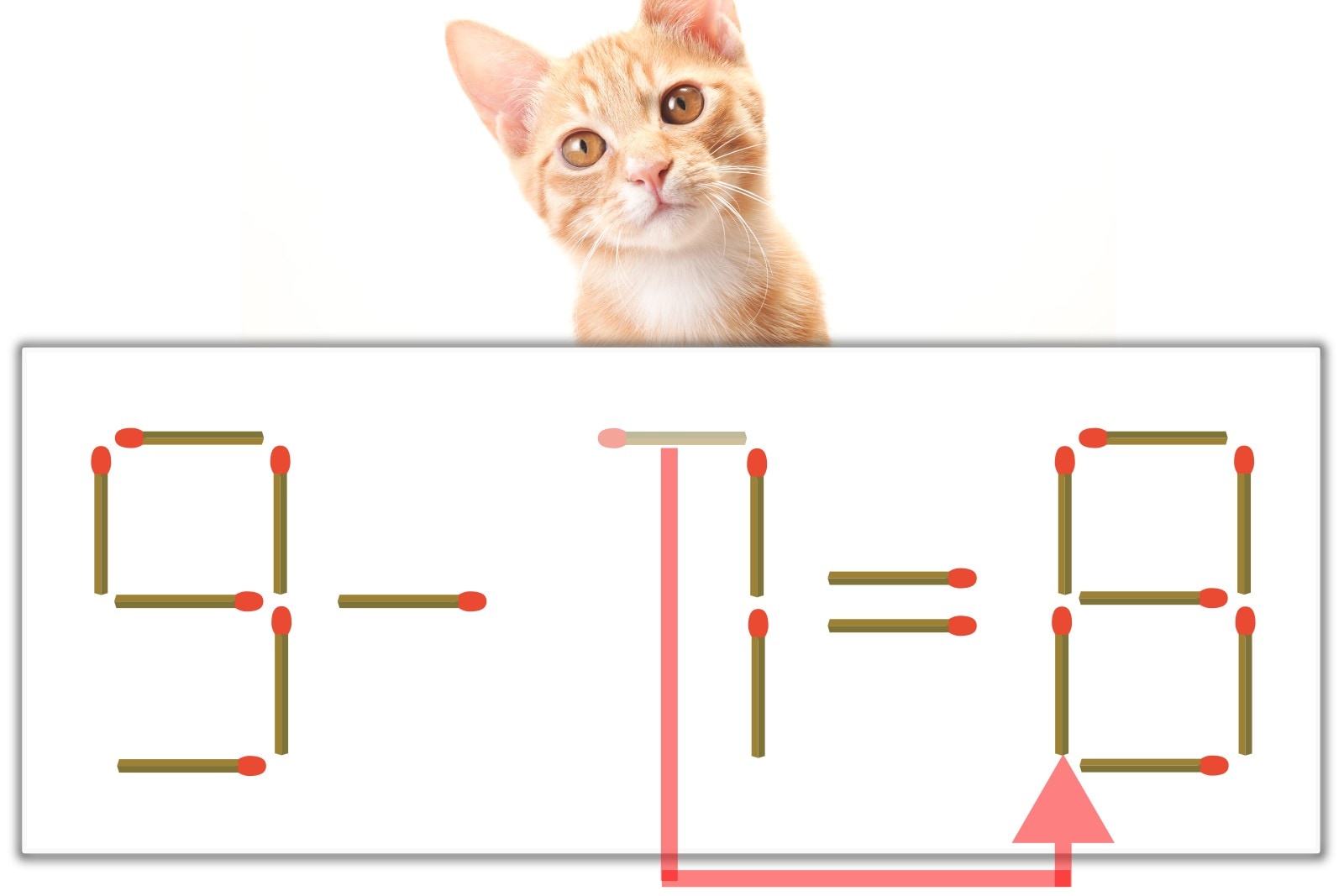 「7」のマッチ棒を1本、右にスライドさせて「8」を作り、「9-1=8」にする。※解答は複数ある場合があります。