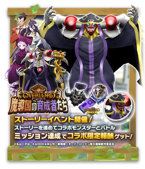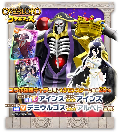 本コラボを記念して、『オーバーロード』をモチーフにしたコラボモンスター、ジョーカー種「アインズ」ウンディーネ種「アルベド」コラボアシストカード「【死の支配者】アインズ」「【炎獄の造物主】デミウルゴス」が手に入るガチャイベント「オーバーロードコラボフェス」を開催します。「オーバーロードコラボフェス」では、★3モンスターの出現確率が15%から20%にアップします。