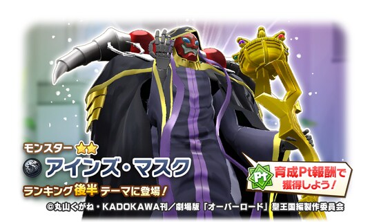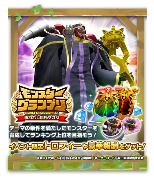 コラボの開始を記念して、ジョーカー種「アインズ」とウンディーネ種「アルベド」のコラボモンスターや、「【死の支配者】アインズ」と「【炎獄の造物主】デミウルゴス」の新アシストカードが手に入るガチャイベント「オーバーロードコラボフェス」を開催します。また、アインズたちがモンスターファームの世界に登場するゲーム内イベント「オーバーロード ~魔導国の育成者たち~」のほか、「モンスターグランプリ 呪われし嫉妬マスク」やログインボーナスも開催します。