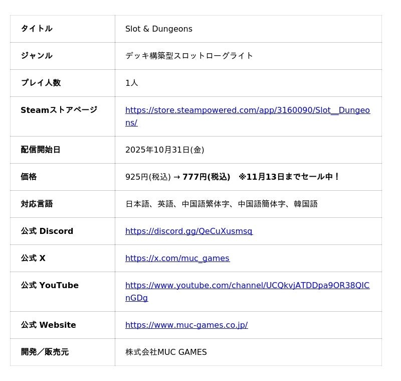 株式会社MUC GAMES(ムックゲームス)(東京都世田谷区、代表取締役社長:粟村 隆一)は、デッキ構築型スロットローグライト『Slot & Dungeons』のSteam早期アクセス版を2025年10月31日より配信開始したことをお知らせいたします。