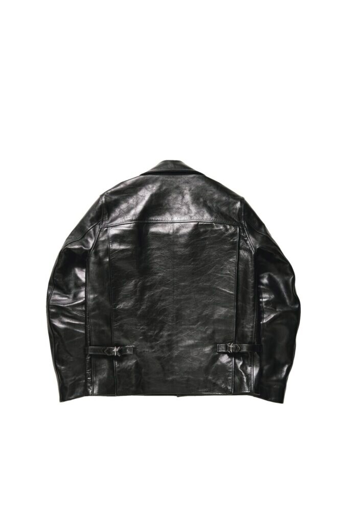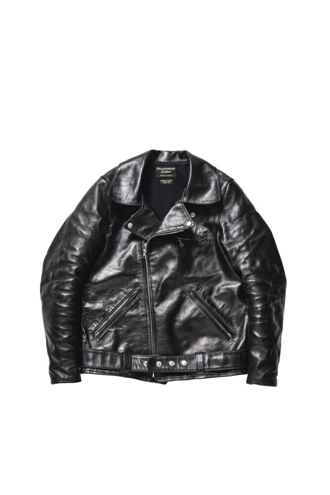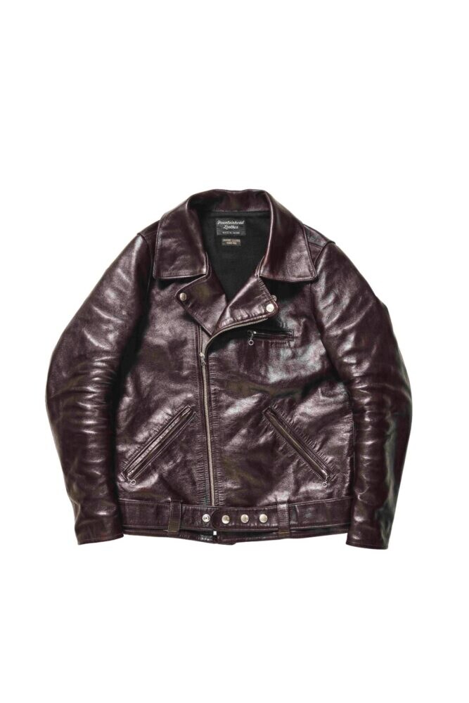 1940年代のライダースジャケットをベースに、ファウンテンヘッドレザーなりの解釈で現代的に甦らせた意欲作。シンプルな意匠ながら、大振りな襟やベルトのスナップボタンなどが個性を主張している。オリジナル特有のゆったりしたシルエットを解消し、アームホールを細くし、若干着丈を長くすることで今っぽいスタイリッシュなフォルムを実現した。革は前ページのXI同様のフルベジタブルタンニン鞣し・アニリン仕上げの馬革を採用しており、エイジングは折り紙付き。ブラック、ブラウン共に着込むほどに茶芯が出現する。21万8900円