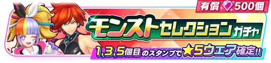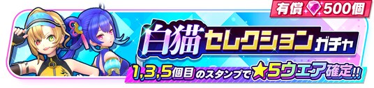 それぞれ★5ウェアが『モンスターストライク』(以下、『モンスト』)の2キャラクターのみ、『白猫プロジェクト NEW WORLD'S』(以下、『白猫』)の2キャラクターのみが登場するガチャの第2弾が開催予定です。本ガチャは有償ジュエル500個限定で5回までまわすことができ、1回目、3回目、5回目のスタンプでは★5ウェアが確定となります。『モンスト』からはジャック・ザ・リッパー(CV:高橋李依)、エクスカリバー(CV:小西克幸)の2人が、『白猫』からはシャルロット(CV:内田真礼)、ノア(CV:水瀬いのり)の2人が登場します。それぞれのキャラクターは限定ウェアも登場します。