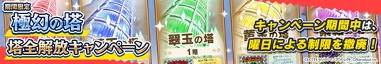 期間中は、曜日による制限を解除して、毎日「紅焔の塔」「蒼天の塔」「翠玉の塔」「黄金の塔」「紫紺の塔」を登ることができるキャンペーンを開始いたしました。