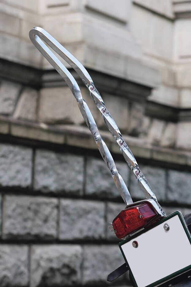 10インチオーバーのロングスプリンガーにフロントブレーキレスのハードなフロントエンド。ハイライザーにナローなロボハンを装備したハンドルまわりは都会のすり抜けに適したスリムなセットアップ。荷物の積載用のシッシーバーは気分でフェンダーステーと取り換えが可能。