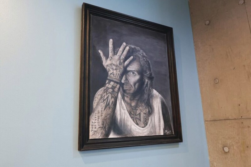 いまは亡きNYブルックリンのレジェンドビルダー、Indian LarryはMinatoさんにとってのチョッパーヒーローのひとり。アーティストのMUさんが描いたポートレートがショップにディスプレイされる。