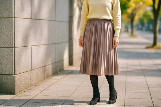 スカートやワンピースは、サテンやプリーツなど光を含む素材を合わせるのが今っぽい。動くたびに表情が出て、おしゃれ見えが自然と叶います。素材のコントラストを意識すると、黒タイツでも“重くならない”冬コーデに仕上がります。
