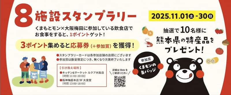 イベント参加店舗を巡って楽しめる「8施設スタンプラリー」も実施されます。対象の飲食店で食事をすると1ポイントが貯まり、3ポイント集めると応募券と参加賞として「くまモン缶バッジ」がプレゼントされるそう。抽選で10名に熊本県の特産品が当たります。