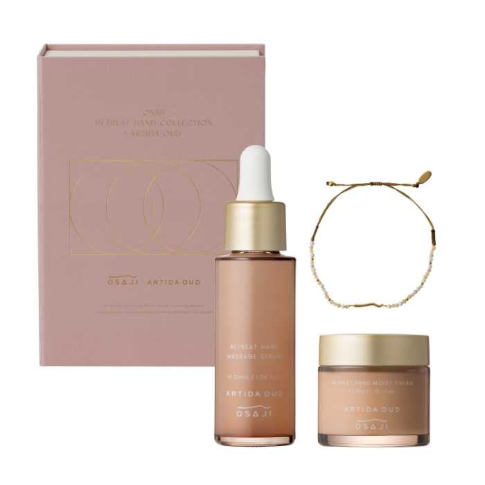 今回登場する「OSAJI リトリートハンドコレクション × ARTIDA OUD」(7,700円・税込)は、ARTIDA OUDの天然石ブレスレットとOSAJIの人気ハンドケアアイテムを組み合わせた限定セットです。