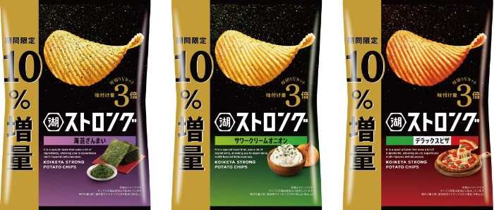 この秋、「湖池屋ストロング」では定番3品(海苔ざんまい・サワークリームオニオン・デラックスピザ)も10%増量で登場。新フレーバーと一緒に、秋の味覚をたっぷり堪能してみてはいかがでしょうか。