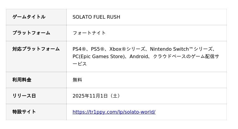 株式会社Trippy(本社:東京都新宿区、代表取締役社長:漆原陸、以下Trippy)は、太陽石油株式会社(本社:東京都千代田区、代表取締役社長:山本 堯大、以下太陽石油)と共同で、6億人以上が遊ぶオンラインゲーム「フォートナイト(Fortnite)」において、サービスステーションブランド「SOLATO」をテーマにしたオリジナルゲーム『SOLATO FUEL RUSH』を制作しました。