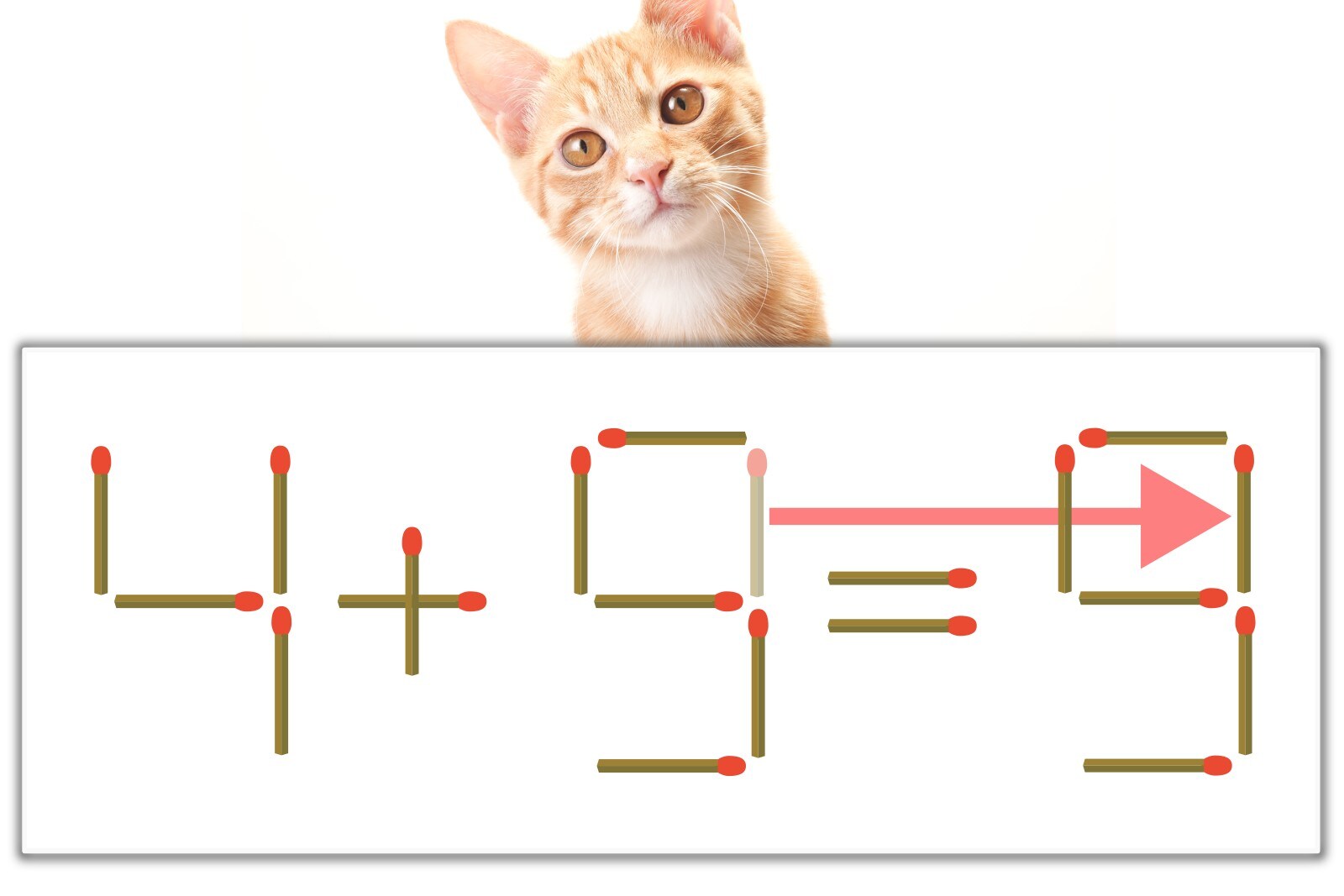 「9」のマッチ棒を1本、右にスライドさせて「9」を作り、「4+5=9」にする。※解答は複数ある場合があります。