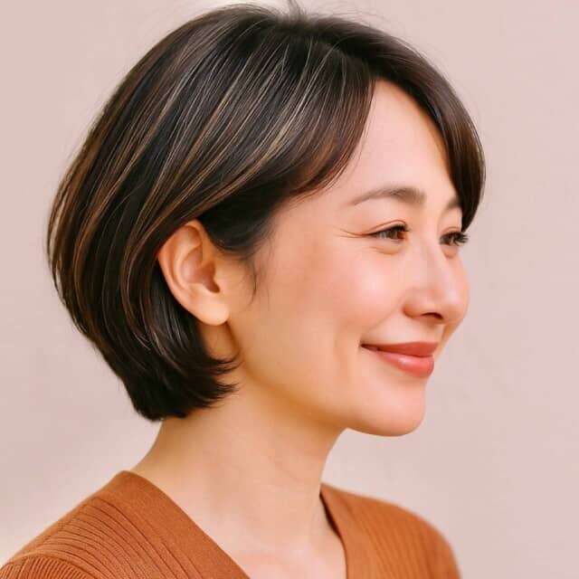 白髪ぼかしとして人気のハイライトは、今や大人ショートの定番テク。細めのハイライトを数本入れるだけで髪に奥行きが出て、自然な立体感を演出します。