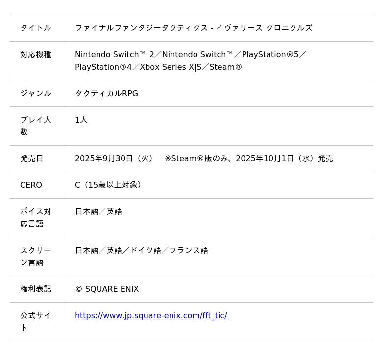 株式会社スクウェア・エニックス(本社:東京都新宿区、代表取締役社長:桐生 隆司)は、2025年9月30日(火)発売予定のタクティカルRPG『ファイナルファンタジータクティクス - イヴァリース クロニクルズ』の最新トレーラーを本日公開しました。