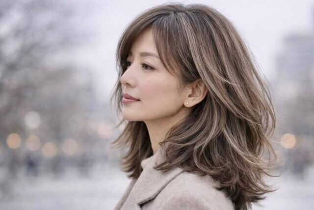 見た目年齢マイナス5歳を叶えるなら、明るすぎない落ち着いたトーンの「グレイッシュカラー」が断然おすすめ。赤みや黄みを抑えた透明感のある色味が大人の魅力を引き立てます。