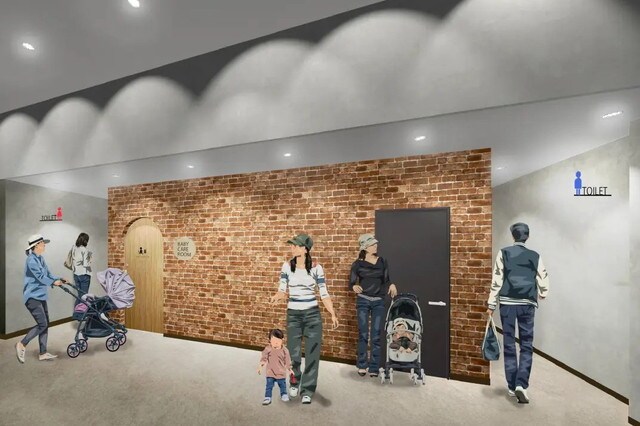 (左)隣接する商業施設サザンモール六甲B612との接続部、(右)新設されるトイレ、ベビールーム