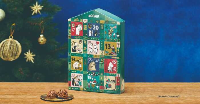 ムーミンハウスやグリーンデザインのカレンダーにはチョコクランチ12個入り、缶には可愛いムーミンたちのイラスト入りチョコクランチが詰まっています。