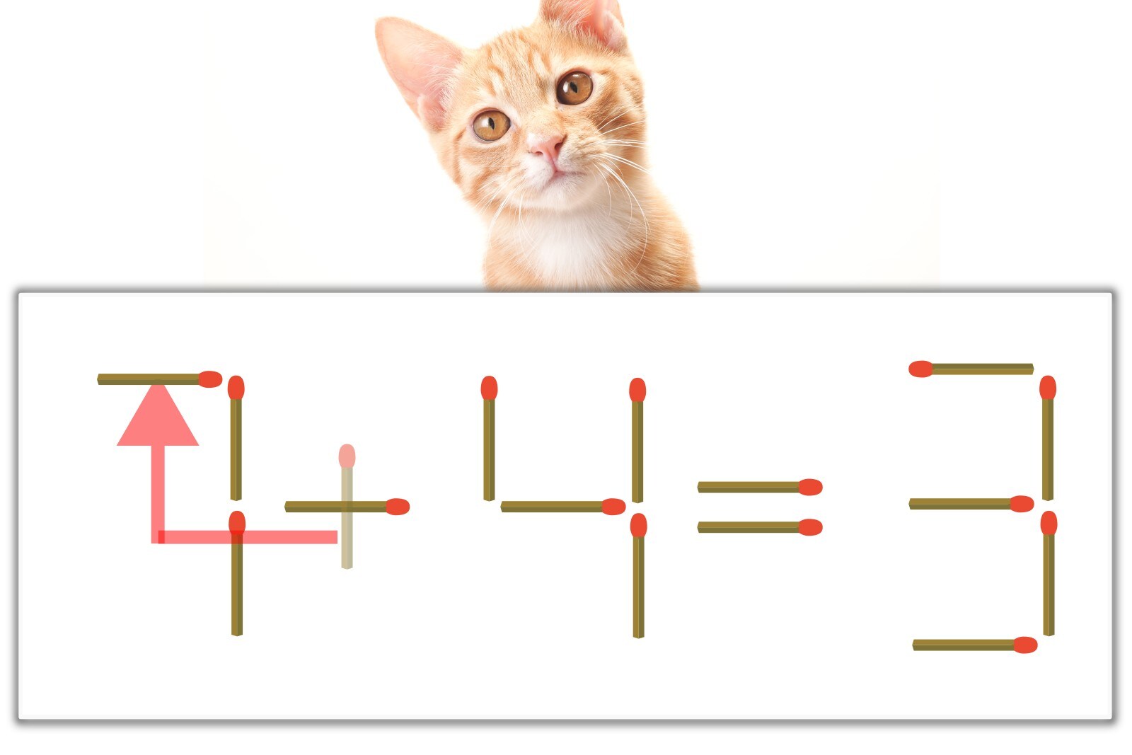 「+」のマッチ棒を1本、左にスライドさせて「7」を作り、「7-4=3」にする。※解答は複数ある場合があります。