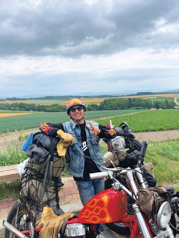 「好きなバイクで走りたいだけですが、チョッパーは軽くて曲がれるし荷物も詰めるから結果的にこのスタイルが自分の走り方に合っているんです。旅の楽しみは、気持ちがイイ道を走ることですが、その中でも北海道の長旅は別格。大自然の中を好きなバイクで仲間と一日中走って、目的地に着いたら食べて飲む、そして朝を迎えたらまた走る。ほかでは味わえない非日常がずっと続く感覚なんです」