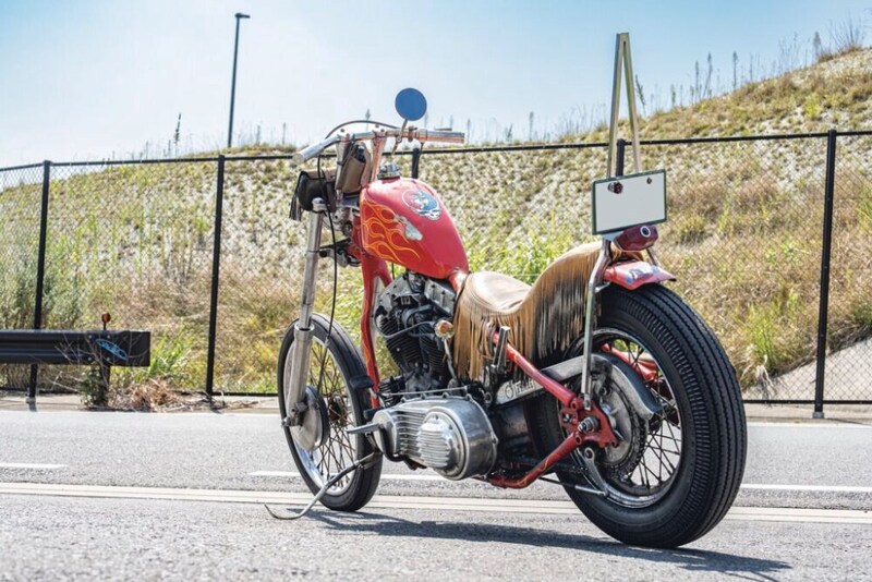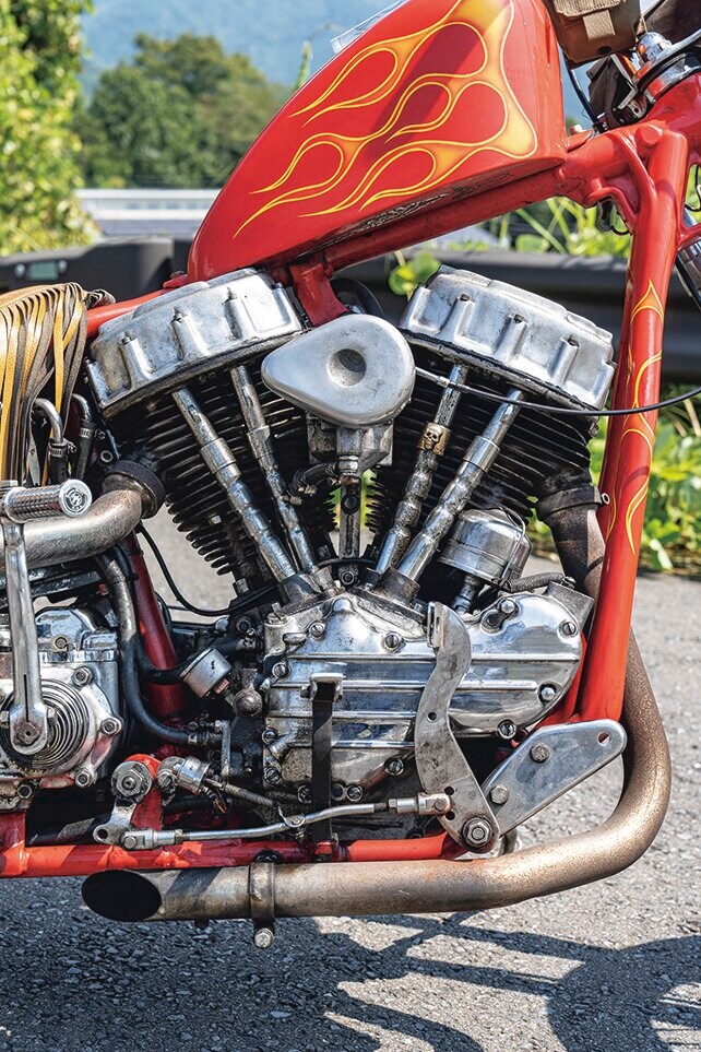 フリスコをベースに、ロングライドを想定してビルドされた旅するパンヘッド・チョッパー。 真っ赤なフレイムスとタンクに描かれたスカル&ローゼズがトレードマーク。6インチオーバーの41フォークやハイペグは、見た目だけでなくワインディングのバンク角を意識した機能的なディテールであることもポイント。