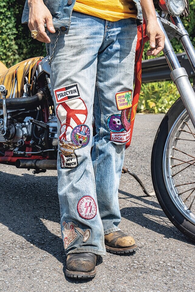 デニムのカットオフとベルボトムが阿部さんの正装。ベルボトムはリーバイス646で、履き込んで破れた部分をパッチでカスタムして補修。インナーのTシャツは19MILEのオリジナルで、CHI-CHI’S坂本さんの描き下ろしのグラフィックがプリントされる。