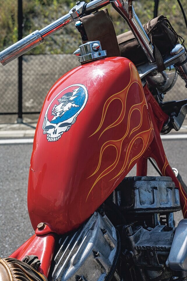 フレイムスのパターンはCHI-CHI’Sのチョッパーがモチーフで、ヘルメットとセットでセルフペイント。エンジンは耐久性を考慮したストックスペック。シフトノブは19MILEのオリジナル。クリアレジンのスカルの中でバラが褪色した雰囲気が◎。フリンジ付きのシートはアトリエティーによるワンメイド。