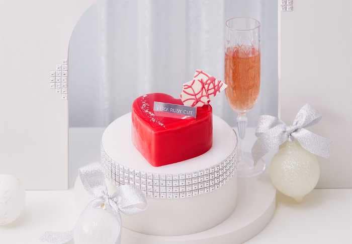 3号サイズの「ベリークリスマスハート」は、ひとめでときめくルビー色のフランボアケーキ。中には香り豊かなダブルベリームースを閉じ込め、甘酸っぱい苺ピューレとフランボワーズの華やかさを融合。