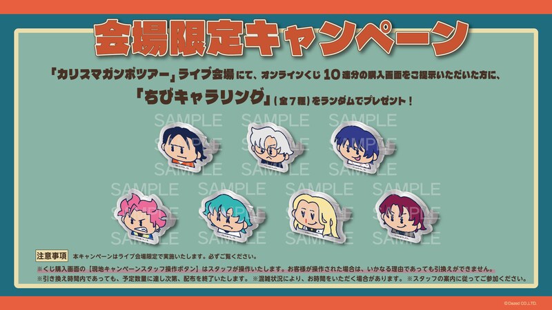ライブ会場にて、オンラインくじ10連分の購入画面をご提示いただいた方に「ちびキャラリング(全7種)」をランダムでプレゼントいたします!<神戸ワールド記念ホール>