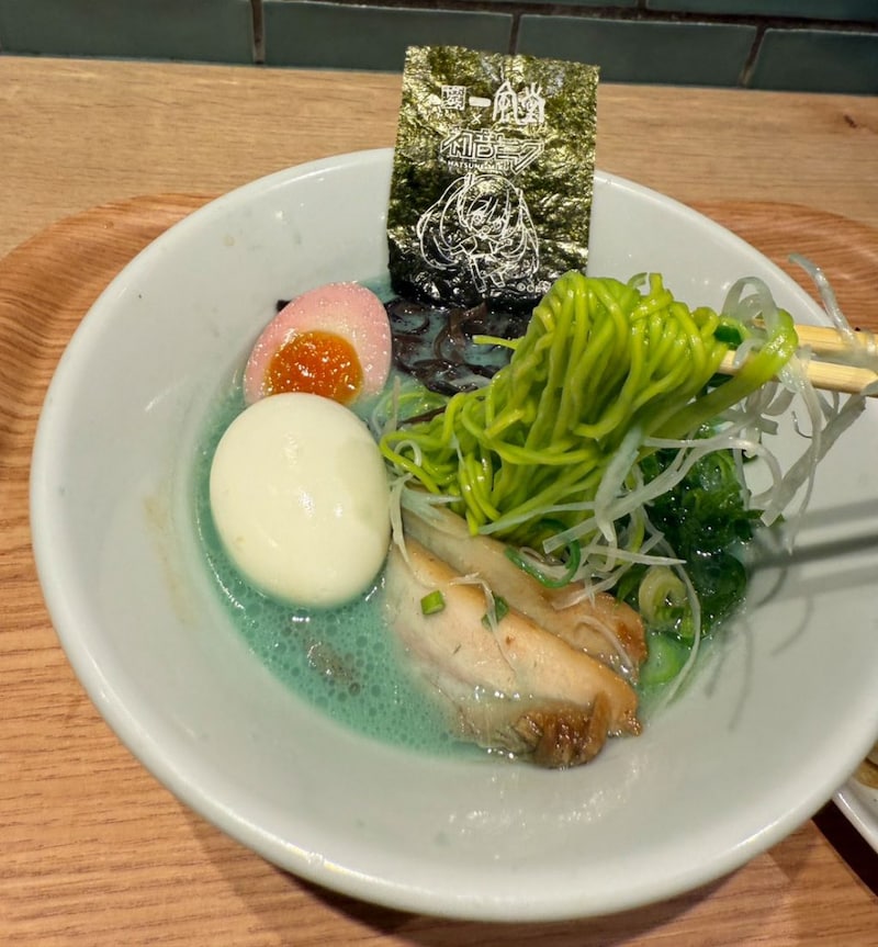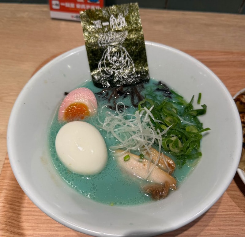 初音ミクがプリントされた海苔がのったラーメン、やはり目を引くのは、ブルーグリーンのとんこつスープ!